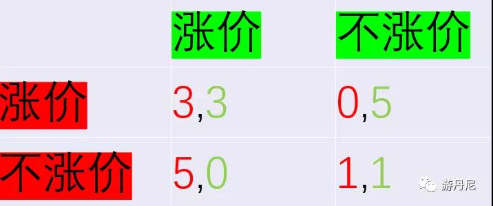 我做了一個簡單的圖,可以看出,如果各方都漲價,那對于各方來說結果是比較好的,收益雙方都是3.一旦一方漲價,另一方不漲,那漲價方的市場份額就會下降,漲價方收益是0,不漲價方收益是5;如果各方都不漲價,那大家的收益都是1(市場份額不變,但是各方成本都增加了).